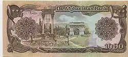 Afs. 1,000 | 160 × 70 mm | Brown | Seal of Da Afghanistan Bank, Shrine of Ali mosque | Taq-e Zafar and Lion Gate |