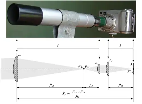 One method of afocal photography is to mount a camera with its lens attached behind the eyepiece of a Keplerian optical telescope, the combination giving the photographer a long focus lens. Historically afocal photography with 35 mm SLR or large format film cameras was a very difficult method of photography. With film cameras the bulk and mechanical shake had to be taken into consideration, with some setups employing a separate tripod for the camera (adding the complexity of setting up the camera in relationship to the eyepiece). The general difficulties of focus and exposure with film cameras, along with the detailed mathematical calculations, combined with the time lag of waiting for the film to be developed, made film afocal photography challenging.[3]