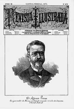 Afonso Pena married Maria Guilhermina de Oliveira on 23 January 1875.[18] The couple went on their honeymoon to Rio de Janeiro, where they met emperor Pedro II.[19] Guilhermina was the daughter of João Fernandes de Oliveira Pena, the Viscount of Carandaí, and the niece of Honório Hermeto Carneiro Leão, the Marquis of Paraná, one of the most prominent politicians in the Empire of Brazil.[20] They had nine children, including Afonso Júnior, who was later Minister of Justice and Internal Affairs to president Artur Bernardes and a member of the Brazilian Academy of Letters,[21][22] and Octávio Moreira Pena, an engineer who carried out several public works in Rio de Janeiro, including the landfill that gave rise to the Urca neighborhood.[23]