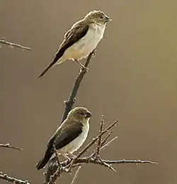 In early literature, the African silverbill and the Indian silverbill (E. malabarica) were treated as conspecific. In 1943, Jean Théodore Delacour united both species in his revision of the Estrildinae.[9] However, in 1964, Colin Harrison studied the two in a strictly comparative manner and concluded that they were two separate species. He discovered that although the call notes were similar, the songs are distinctly different in form, but sharing a common pattern. They are sympatric in the south of the Arabian Peninsula and there is no record of natural hybridization. From Harrison's personal observation of birds in captivity, each of the two forms evinced a preference for its own kind.[10] A molecular phylogenetic study of the Estrildidae published in 2020 found that the African and Indian silverbills were sister species that had diverged around one million years ago. The two species formed a clade that was basal to members of the genus Lonchura.[11]