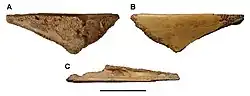 The holotype, FSAC-KK 5004, had been found in the Kem-Kem Beds, dating from the Albian - early Cenomanian. It consists of a snout lacking the front tip and extending to behind to a position below the front of the snout crest. The piece had already been prepared by the fossil traders. Subsequent preparation by Martill, as well as a CT scan, showed that a bone fragment from some other taxon had been used to repair damage to the upper edge. Martill deposited the fossil in the collection of the Département de Géologie (Paléontologie), Faculté des Sciences Aïn Chock.[1]