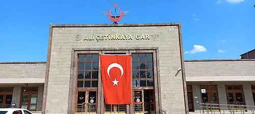 Ali Çetinkaya railway station (Turkish: Ali Çetinkaya garı) is the main railway station in Afyonkarahisar, Turkey. The station is one of Afyon's two railway stations, the other being Afyonkarahisar Şehir railway station. Ali Çetinkaya station was built in 1895 by the Anatolian Railway as part of their main line between Istanbul and Konya. The Turkish State Railways acquired the Anatolian Railway in 1927. In 1936 the State Railways connected the two station together with the opening of the Afyon-Karakuyu line. The station was rebuilt with a station building half the size of the one in Ankara and inaugurated on July 18, 1939, by president İsmet İnönü and Minister of Transport Ali Çetinkaya. Ali Çetinkaya station was always the busier station of the two and after 1939 all railway traffic in Afyon was handled from this station. When Ali Çetinkaya died in 1949, the station was renamed in his honor.[1]