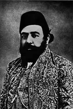 He is descended from the Fatimid caliphs of Egypt.[3] He spent his early years in Mahallat; however, his father's attempts to regain his former position as governor of Kirman made residence there difficult, and so Aqa Ali Shah was taken to Iraq with his mother in 1840. There he studied Arabic, Persian, and Nizari Ismaili doctrine,[1] and soon gained a reputation as an authority on Persian and Arabic literature, as a student of metaphysics, and as an exponent of religious philosophy.[2] In the late 1840s, changed political circumstances allowed Aqa Ali Shah to return to Persia where he took over some of his father's responsibilities.[4] In 1853, Sarv-i Jahan Khanum and Aqa Ali Shah joined Aga Khan I in Bombay. As his father's heir apparent to the Ismaili Imamat, Aqa Ali Shah frequently visited various Ismaili communities in South Asia, particularly those in Sind and Kathiawar.[1]