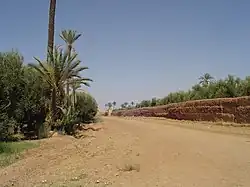 For the rest of its history, the gardens went through a cycle of decline and renewal. When neglected, the gardens quickly ran dry and were prone to desertification. During periods of renewal, later rulers were required to replant the gardens and clear sediments from the reservoirs and channels.[3] After the defeat of the Almohads in the 13th century Marrakesh ceased to be the capital and the gardens underwent a first period of decline. It was only under the Saadian dynasty in the 16th century that the capital returned to the city and the Kasbah, along with the gardens, were restored and redeveloped. During this period the gardens became known as Rawd al-Masarra ("Garden of Happiness").[3][2] The first restoration works, mainly aimed at rehabilitating the water supply system, were carried out by Sultan Abdallah al-Ghalib and further work was continued by Ahmad al-Mansur.[2] Both of them also worked on rebuilding the city's kasbah to the north.[5][7] Historical sources also mention that the Al-Masarra gardens were open to the public and to all of the city's citizens, a tradition which continues to the present day.[2]