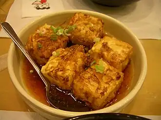 Agedashi dōfu (揚げ出し豆腐, "lightly deep-fried tofu") is a Japanese hot tofu dish. Soft or medium-firm silken tofu (kinugoshi) is cut into cubes, before being lightly dusted with potato starch or cornstarch and then deep-fried until golden brown. It is then served in a hot broth (tentsuyu) made of dashi, mirin, and shō-yu (Japanese soy sauce), with finely-chopped negi (a type of spring onion) and grated daikon or katsuobushi (dried skipjack tuna flakes) sprinkled on top.[1]