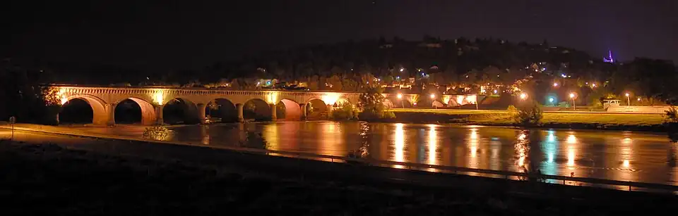 The aqueduct was built entirely of stone blocks from Quercy, under the direction of the engineer Jean-Baptiste de Baudre. On 25 August 1839 Ferdinand Philippe, Duke of Orléans laid the first stone.[1] In 1841 the building of the Bordeaux to Toulouse railway interrupted work on the canal and the aqueduct was rented to farmers for use as a short cut avoiding the Bridge of Agen. The tolls however, were too high to make this idea work. On 5 May 1846 the work was ordered to resume by a vote in favour of a government act. The aqueduct finally came into service in 1849.[2]