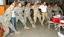 A group of Aggie soldiers in Camp Victory, Iraq doing the "Saw Varsity's Horns Off" portion of the war hymn