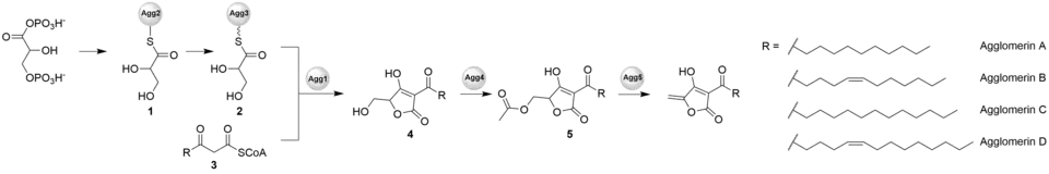 The biosynthetic gene cluster for agglomerins is 12 kb, and codes for 7 open reading frames. The glyceryl-S-ACP is derived from D-1,3-bisphosphoglycerate by Agg2 (glyceryl-S-ACP synthase) and Agg3 (acyl carrier protein).[4] The acyl chain is taken from primary metabolism as a 3-oxoacyl-CoA thioester. The glyceryl-S-ACP and 3-oxoacyl-CoA thioester are joined by Agg1, a FabH-like ketosynthase, forming new C-C and C-O bonds. The primary alcohol of the intermediate 4 is then acylated by Agg4, using acetyl-CoA, before the abstraction of a proton and concomitant loss of acetate catalyzed by Agg5 to generate the exocyclic double bond.[5]