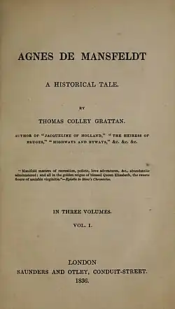 Agnes de Mansfeldt is an 1836 historical novel by the Irish writer Thomas Colley Grattan, published in three volumes.[1] It was his third novel, although he remained best known for his travelogues. Like the previous two it was strongly influenced by the Waverley novels of Walter Scott. It is set around the time of the Cologne War of the 1580s, provoked in part by the marriage of Agnes von Mansfeld-Eisleben to the Elector of Cologne and his conversation to Protestantism. In his preface, Grattan draws parallels between these historical events and the contemporary situation following the Belgian Revolution and the 1831 Treaty of London.