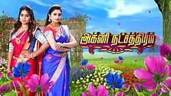 Agni Natchathiram is a 2019- 2021 Indian Tamil-language television series starring Varshini Arza, Mersheena Neenu, Gayathri Raj and Vasanth Vasi.[1] It premiered on Sun TV from 27 May 2019[2] on Monday to Saturday at 11:30 AM and ended on 3 April 2021 with 414 episodes.[3]