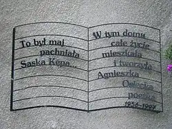 Osiecka was born in Warsaw, the only child of Wiktor Osiecki, a pianist and composer of Serbian, Romanian-Vlach and Hungarian descent, and a scholar Maria Sztechman. She spent her early years in Zakopane where her father played the piano at the Watra Restaurant. After World War II the Osiecki family moved to Warsaw and settled in the Saska Kępa borough. The small flat soon became Osiecka’s favourite place to work. She lived there almost her entire life. After her death, the Okularnicy Foundation placed a commemorative plaque on the building.[2]