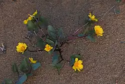 Agnorhiza bolanderi is a perennial herb growing from a thick taproot and caudex unit. This underground stem part helps it survive wildfire, which is common in its chaparral habitat.[3] The aboveground stem grows up to 30 centimeters long. It is glandular and sticky in texture. The leaves have oval blades up to 12 centimeters long. The inflorescence is a solitary bell-shaped, sunflower-like flower head sometimes tucked amongst the uppermost leaves. The head contains about 13 yellow ray florets which may be 2 to 3 centimeters long or more. At the center are yellow disc florets. The fruit is an achene about 7 millimeters long which does not have a pappus.[6][7]