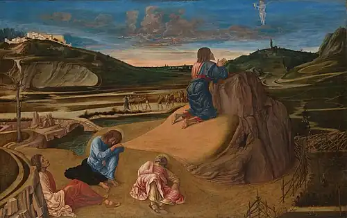 The picture is closely related to the similar work by Bellini's brother-in-law, Andrea Mantegna, also in the National Gallery. It is likely that both derived from a drawing by Bellini's father, Jacopo.[1][2] In Bellini's version, the treatment of dawn light has a more important role in giving the scene a quasi-unearthly atmosphere.