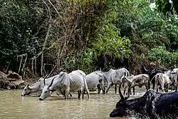 There is no predominant breed of cattle in the country, with a constant mixing of the herd. Breeds most common in Benin include Lagune (Dwarf West African Shorthorn), Somba (Savannah Shorthorn), Borgou (local cross between Zebu and humpless crossbred), and Zebu. Most of the cattle are raised in a seasonal migration pattern, with a small portion (20% or less) raised in a sedentary manner mostly in the southern portions of the country. Borgou, Alibori, Atacora, and Donga Districts hold most of the cattle. Fulani are the main herders, and often work for hire. Herds are moved from north to south and back, depending upon available forage and water supplies. Herds in the north can be as large as 80 or so animals. Most cattle are raised for meat, some cattle near towns produce milk for sale. A few cattle in the northeast area are raised in small herds with very limited movement (Somba farmers), and a larger group in the southern area are raised with a few animals per household, where the households are in areas demarked by waterways. Here the animals are moved around depending on availability of forage from location to location, household by household. Some villages hire herdsmen to oversee the village animals. Total herd size for the country is estimated at between 750,000 and 1 million animals.[1]