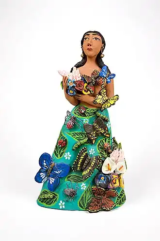 Leticia García Aguilar was born in 1978 and is the only girl of nine children born to Josefina Aguilar Alcántara. She started working with clay as a young girl, intrigued from watching her mother work.[2] Leticia's art is known to have a notable use of color as well as expressive faces in her figures. She draws inspiration from nature, myths, her indigenous culture, and the many facets of womanhood. In developing her practice, Leticia has learned to let the artistic process flow naturally and to not let an idea restrict her creative journey.[2]