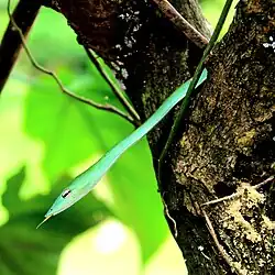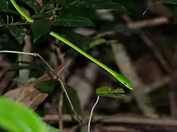 The Sri Lankan green vine snake is diurnal and arboreal, occasionally descending from the trees to search for food.[7] It primarily feeds on lizards and frogs, but also occasionally other snakes, birds, and mammals.[10] It is a slow-moving camouflage hunter, often extending its body and slowly swaying in imitation of a tree branch. When disturbed, they may expand their bodies to show a black and white scale marking and open their mouths in a threat display.[7]