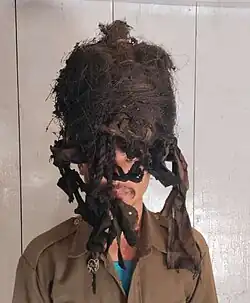 The frame of the hat is fine cane usually in red colour with red goats' hair and hornbill feathers on top frequently with a chain of tigers' claws that hangs around the chin.[3] Some are decorated with double transparent flat horns on both sides.[4] These are made from mithan's horn.[5]