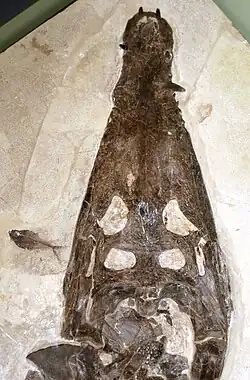 As expected from an environment dominated by swamps and rivers, the Golden Valley Formation has produced a plethora of fossils belonging to aquatic and semi-aquatic animals. Fish are represented in part by bowfins and gars and amphibians by frogs and salamanders (including the genera Batrachosauroides and Chrysoriton). A number of freshwater turtles are also known, including Baptemys, Echmatemys and Plastomenus, as well as softshell turtles of the genus Trionyx.[1]