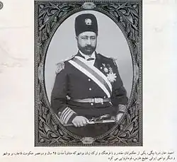 His research in 1887 provided the landscape for official Iranian claims to the islands of Greater and Lesser Tunbs and Abu Musa.[1] During Naser al-Din Shah Qajar, he became the first Iranian captain of the Persepolis Battleship in Bushehr that Iran had recently purchased from Germany. He designed the first Iranian Navy uniform and later became the Lord Admiral (Maritime Frontier-Keeper) of the Persian Gulf.[2] In 1893, he became the Governor of Bushehr and Southern Ports and Ommanat.[3][4] In March 1899, he conquered Port of Lingeh (Bandar Lengeh) and returned it to Iran's sovereignty.[5]