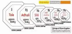 Coins were both issued in gold and silver. The standard of purity was very high, between 94.1% to 98%. The standard weight was 11.3g with minor variations. The official mint was called Rajshal, located near the capital city. The mintmaster was called Sonardar Barua or Sonari Bordoloi, and the artist belonging to akharkatia khel (calligraphers guild) and khanikar khel (miner's guild) were employed as die-cutter. The principal denominations of Ahom coins were– rupee (Rajmohuree), half rupee (Adhali), quarter rupee (Siki), two annas (Admahia), one anna (Charatiya) and half anna (Tiniratiya).[4]