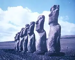 In 1955, Thor Heyerdahl recruited American archaeologist William Mulloy and his Chilean associate, Gonzalo Figueroa García-Huidobro, who later restored the statues to their original position; they had found them in knocked down condition in 1960.[1] Mulloy's work on the Akivi-Vaiteka Complex was supported by the Fulbright Foundation and by grants from the University of Wyoming, the University of Chile and the International Fund for Monuments. Ahu Akivi also gives its name to one of the seven regions of Rapa Nui National Park.[1]