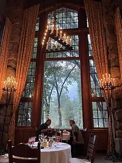 The Grand Dining Room is 130 feet long and 51 feet wide, with a 34-foot ceiling supported by rock columns, creating a cathedral-like atmosphere.[44] For fire safety reasons, the wood beams in the dining room are actually hollow and contain steel beams. The alcove window at the end of the room perfectly framed Yosemite Falls when the hotel was completed.[17] Although the dress code for the park is usually very casual, the Ahwahnee Dining Room used to require a jacket for men, but it later relaxed that tradition. Now collared shirts for men are allowed and women may wear either a dress or slacks and a blouse.[45]