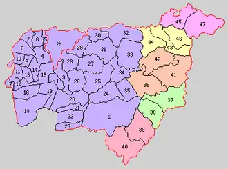 * yellow - areas formerly within the district borders during the early Meiji period