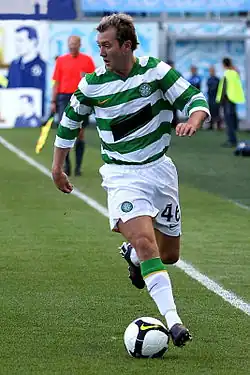 His senior debut, at age 18, came on 24 April 2004 in a league game against Hearts at Tynecastle late in the 2003–04 season. He started the match, scored a goal after 17 minutes,[11] and finished that season with four league appearances as Celtic won the league.[12] He made his UEFA Champions League debut the next season in a game against Italian side AC Milan and made the breakthrough into the first team that same season, with 27 appearances in the league as Celtic finished runners-up in Martin O'Neill's final campaign with the club. He also featured as a late substitute in the season's Scottish Cup Final in which Celtic defeated Dundee United 1–0.[13]