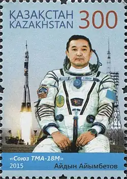 Aidyn Akanuly Aimbetov (Kazakh: Айдын Ақанұлы Айымбетов, Aidyn Aqanūly Aiymbetov; Russian: Айдын Аканович Аимбетов,[1] born 27 July 1972) is a Kazakh cosmonaut, the first flying as national of independent Kazakhstan. The first from Kazakhstan was Toktar Aubakirov (1991).