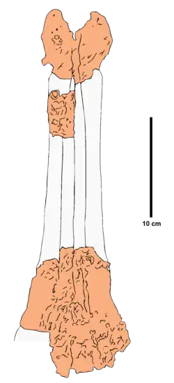 Aigialosaurus was a long- and narrow-snouted crocodylomorph.[1][5][6] The bony nostrils on both sides of the head were fused to form a single larger fenestra (skull opening), dubbed by Persson as a fenestra exonarina communis. The nasal bones on both sides of the skull extended forwards until reaching the margin of this skull opening, this being the main diagnostic feature of the genus.[7] Another diagnostic feature is the mandibular symphysis (the connection between the left and right mandible) of Aigialosuchus being unusually long,[1] 13.8 centimetres (5.4 inches),[8] and being reached by the splenial bone.[1]