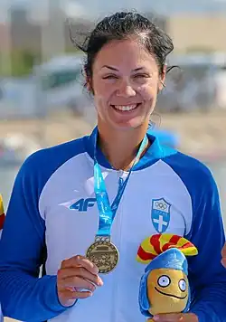 Aikaterini "Katerina" Nikolaidou (Greek: Αικατερίνη "Κατερίνα" Νικολαΐδου; born 22 October 1992) is a Greek rower. Nikolaidou represented Greece,[1][2][3][4][5] along with Sofia Asoumanaki at the 2016 Summer Olympics in Rio de Janeiro, Brazil, finishing in the 4th place (double sculls).[6][7][8][9][10] She also won a silver medal, in the lightweight single sculls at the 2013 World Rowing Championships and 2014 World Rowing Championships,[11] and in the lightweight double sculls along with Sofia Asoumanaki at the 2015 World Rowing Championships.[12] She won the gold medal in the lightweight single sculls at the 2014 European Champion and 2013 European Champion.[13][14][15][16][17] She won the gold medal in the single sculls, at the 2018 Mediterranean Games in Tarragona,[18][19][20] and at the 2013 Mediterranean Games in Mersin.[21][22][23]