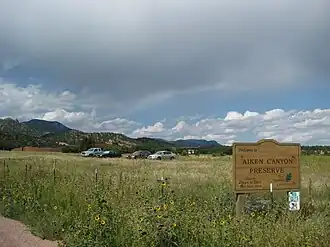 Aiken Canyon Preserve is a 1,621-acre (6.56 km2) Nature Conservancy-managed state property in Colorado. It was first observed and named after Charles Aiken, a 19th-century U.S. surveyor, pioneer, and ornithologist who first surveyed the region in the 1870s and identified more than 75 bird species.[1] The preserve consists of foothills, shrub and woodland ecosystems and is 12.4 miles (20.0 km) southeast from Colorado Springs located on the eastern slope of the Rampart Range which is within a smaller foothill system of the Front Range. The surrounding mountain ranges of the Rampart Range and Palmer Divide created the nature preserves sustainable ecosystem.[2] There is also a four-mile (6 km)-loop hiking trail on the preserve.[3]