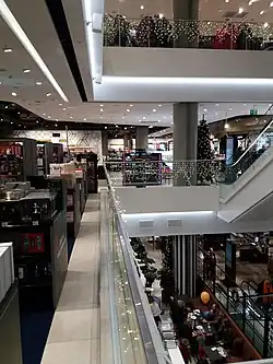 The bottom floor of the shopping centre, designated the floor M, hosts grocery stores, fast-food restaurant and quick-access stores. The fashion and interior design stores have mainly been located on the first and second floors.[1] The third floor hosts a Terveystalo health centre and the Ainoa Food Garden restaurant area. The fourth floor hosts some beauty care specialist stores.[2]