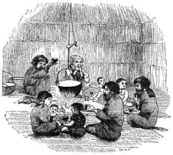 When guests were over for food, the head woman of the house would offer food and say “ipeyan” (please eat). The guest would express their gratitude, and, if it were a valuable meal such as bear meat, they would raise the food to their forehead in thanks before beginning. However, the family would not say anything before eating if there were no guests. Once finished, it was customary to say “hunna” to express their gratitude for the food.[2]: 412