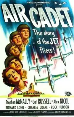 Air Cadet is a 1951 American drama war film directed by Joseph Pevney and starring Stephen McNally, Gail Russell, Alex Nicol and Richard Long. Air Cadet featured United States Air Force (USAF) pilots in training along with actors mixed into the training courses.[2] [Note 1] The film had a small early role for 26-year-old Rock Hudson and a scene with future astronaut Gus Grissom.