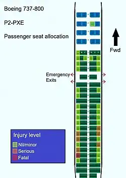 The aircraft was operating an internationally scheduled passenger flight from Pohnpei Airport, FSM to Port Moresby Airport, Papua New Guinea via Chuuk International Airport, FSM. At 10:10 local time (00:10 UTC), the aircraft landed in the Chuuk lagoon 135 metres (443 ft; 148 yd) short of Chuuk International Airport. Initial reports stated that all 12 crew and 35 passengers were rescued by local boats and United States Navy personnel.[2][6] However, a male Indonesian passenger was reported missing after the evacuation. Three days of searching failed to locate the missing passenger seated at 23A, and the investigating commission requested a verification search of the airplane. On 1 October 2018, Japanese divers located the passenger between partially submerged seat rows 22 and 23, in the vicinity of a fuselage fracture; he had not been wearing a seatbelt.[7] Air Niugini had previously stated that the deceased passenger had been seen by other passengers evacuating the aircraft.[8] Nine people were taken to hospital.[9][10] Six passengers were seriously injured.[11] Some of the injured sustained broken bones. It was reported that there were thunderstorms in the vicinity of the airport at the time of the accident.[12] The aircraft subsequently sank in 30 metres (100 ft) of water.[6]