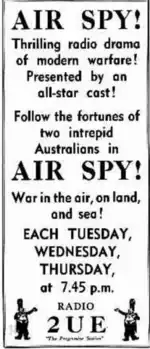 Air Spy is a 1939 Australian radio serial starring Arundel Nixon and Ronald Morse. It was one of the first Australian radio dramas to expressly reference World War Two.[1][2] It debuted on 12 December 1939.[3]
