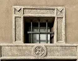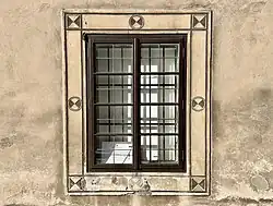 The facade also features window openings arranged such that three windows and the door with the transom illuminate the northern room, while the windows on the first three axes illuminate the southern room.[1] They are adorned with sgraffito.[3] The windows are double-winged and crossbarred, divided into smaller panes by muntins. Each opening has two panes, between which iron grilles made of square rods are installed in the frame. The lintels above the window openings are brick-arched, while both door and window openings are splayed on the inside. Two lanterns are also mounted on the front wall.[1]
