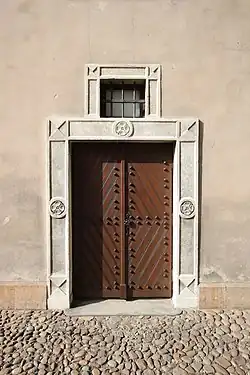 The facade's main ornament is a Mannerist door portal in the form of a stone frame decorated with rose windows and four-petaled flowers placed on the lintel and at the center of the jambs.[1][10] Additional embellishments include square envelopes located in the corners of the frame. The transom above the doorway is protected by an iron wrought grille and framed similarly to the door portal, but without rose windows.[1]