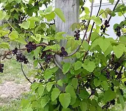 Akebia trifoliata is a climbing vine with leaves composed of three ovate, slightly lobed leaflets, often bronze-tinted when young. It grows up to 9.1 m (30 ft) long.[2] It loses its leaves in cold climates, but the twining woody branches are handsome even when bare. Flowers are deep purple in short racemes and followed by light purple fruits.[3]