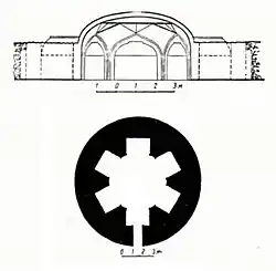 It is considered that the mausoleum was constructed by Ahmad ibn Eyyub.[1] Earlier, the mausoleum belonged to a group of cylindrical “tower” mausoleums. At present, only the underground burial vault is saved from the building. It is also noted that the mausoleum attracts attention with features by which it is distinguished among other monuments of the architectural school of Nakhchivan.[1] Organization of the inner space in form of six-ended cross is not met anywhere. Ascetic strictness of interiors contrasting with a mosaic space of domes and strippings of the overhead cover is also mentioned.[1]