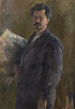 In 1905, at the age of 22, Jørgensen went to a private drawing school, which he attended in the evenings after school. There he met an art dealer of the same age, Martin Grosell, who bought some of his paintings and promised to buy more works in the future. That evening, Jørgensen got another serious ear infection and had to have an operation. What remained was a slight paralysis of the facial muscles, which he concealed with his beard. During the weeks of illness, the decision matured to only live with, for and from art in the future, which he implemented after returning from the hospital against the will of his parents. During this time Jacob Hegel, director of the largest Danish publishing house Gyldendahl, commissioned Jørgensen to conduct milieu studies specifically for “Holmensgade”, a slum in the old town of Copenhagen. The paintings were created under the most primitive conditions without a studio of their own. Violence, prostitutes and alcohol were the order of the day there. At first, Jørgensen was viewed critically by the residents. Gradually, however, he was accepted and appreciated. During a dance event he met the flower binder Christine Carlsen; the two soon became a couple. She was a maid for the Senstius family of teachers and introduced them to her fiancé. Through his family he gained access to literature, music and many important personalities. The friendship with the family lasted a lifetime. Jørgensen made his debut at the free art exhibition "Den Frie Udstilling" in 1908. In 1909 he exhibited with "De Tretten", the artist group "The Thirteen", presenting his favorite subjects of prostitutes and destitute people living in demolished buildings in the poorest neighborhoods of Copenhagen, thereby attracting press attention. He is also known for his engravings, which are characterized by large areas of light and shadow and the use of wood grain, as in his portrait of the writer Jens Pedersen (1908). Jørgensen was a committed socialist himself. Together with Storm P. he founded the socially critical satirical magazine Gnisten (the spark) in 1908 and published some of his sketches. At the age of 26, the final breakthrough came at an exhibition in which he showed around 100 pictures. The works that followed were shaped by encounters with Edward Munch and Henrik Lund. From now on he worked more with the spatula. "The form, the contours are more important to me than the detail," he wrote in a letter. In 1909 Jørgensen met the innkeeper Lorry Feilberg. He had the idea of decorating his establishment in honor of the Danish poet Holger Drachmann with paintings that reproduce texts, themes and characters from Drachmann's works. In the midst of the works, Aksel and Christine married on October 9, 1910. Their daughter Rut was born on March 4, 1911. Although L. Feilberg paid an advance, it was difficult to feed his wife and child. In 1912 the famous Danish art collector and successful grain trader Christian Tetzen-Lund commissioned numerous works for the dining room of his villa. Jørgensen's early work is heavily influenced by impressionism. Inspired by his experiences with Cézanne. In September 1913, after almost four years, the restaurant "Drachmanns Kroen" finally opened and caused a stir. The following year there was a dispute between Feilberg and Jørgensen, who felt cheated of his wages. The conflict caused Jørgensen to have a nervous breakdown, fell into a deep four-year creative crisis and withdrew strongly. Tetzen-Lund helped the family by letting them live in his various houses on the coast and in Jutland. With the help of Tetzen-Lund, Jørgensen bought a house in Kongens Lyngby, a suburb of Copenhagen. Expressive self-portraits in particular were created during this period.[3]
