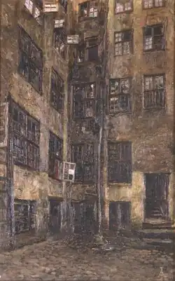 He also organized traveling exhibitions for Danish schools. The art historian Elisabeth Laur concludes that it is Jørgensen's teaching and school that significantly established graphic arts in Denmark from the 1920s. Dagmar Warming, museum director at Ribe Kunstmuseum, describes Aksel Jørgensen as a "central figure in Danish art, and his graphic work as an epoch-making work".[5] Jørgensen's students included artists and graphic artists such as Henry Heerup, Ib Spang Olsen, Richard Mortensen, Frede Christoffersen, Samal Joensen-Mikines and Asger Jorn. During his early phase in particular, he produced many high-contrast, expressive and socially critical woodcuts. Here, too, Jørgensen repeatedly took up motifs from the poor district of Holmensgade in Copenhagen, about which he also made many oil paintings at the same time. As in his works in oils, Jørgensen's early work is characterized by numerous portraits of important people in Denmark in the early 20th century. The graphic works are of the highest quality and only appeared in very small editions.