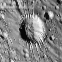 Al-Bakbuk is an impact crater in the northern hemisphere of Saturn's moon Enceladus. Al-Bakbuk was first observed in Cassini images during that mission's March 2005 flyby of Enceladus. It is located at 5°39′N 191°11′W / 5.65°N 191.19°W[1] and is 9 kilometers across. Since the crater's formation, numerous north–south trending fractures cut across the crater, forming canyons several hundred meters deep along the crater's rim.
