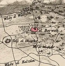 The more ancient site, Tel Birwa (variant: Tel Berweh), lies about one mile southwest of the Arab village by the same name, and is said to be a mound measuring 600 paces in circumference at the top, and 75 feet high. The mound abounds with Graeco-Roman potsherds, showing that it was occupied down to Roman times when it was abandoned, as no distinctively Arab pottery could be found there.[13] Conder and Kitchener thought that Al-Birwa preserves in its name the more ancient name of Beri (Hebrew: בירי), mentioned in the Jerusalem Talmud (Pesahim iv.1 [26a]), seeing that both it and Kabul are mentioned together.[14] According to Josephus, the villages in the immediate vicinity of Kabul were pillaged and burnt during the First Jewish revolt against Rome.[15]