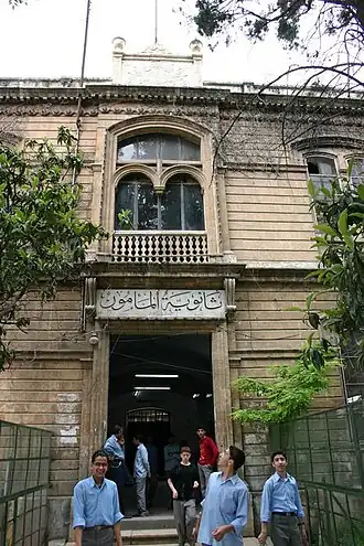 - ^ a b c "من أقدم دور العلم في سوريا ثانوية المأمون قاومت الفرنسيين وخرجت الرواد" [One of the Oldest Educational Institutions in Syria: Al-Mamoun High School, Resisted the French and Graduated Pioneers]. Al-Bayan (in Arabic). 20 April 2000. Archived from the original on 23 April 2025. Retrieved 14 November 2024.