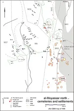 During the course of explorations in 1973, archaeological sites came to light to the team of J.H. Humphries and R.H. Meadow.[1] In 1976 the British D. B. Doe & B. de Cardi conducted more extensive surveyed and returned to the area.[2] Given its large size, a more intensive effort was deemed necessary to reveal its information. Beginning in 1977 to 1981 Gerd Weisgerber of the German Mining Museum in Bochum undertook extensive survey and excavation in al-Maysar and Samad in search of the copper producing land of Magan/Makkan (respectively Sumerian and Akkadian).[3] The team researched sites of various period, most notably "al-Maysar" M1 (Umm an-Nar period metal production settlement), Lizq L1 (Early Iron Age mountain fort),[4] M42 (Early Iron Age settlement), M34 (Late Iron Age fort)[5] and M9 (Late Iron Age cemetery),[6] and the nearby al-Akhdhar cemetery.[7] The falaj which runs north-south provides a historic line with which we can follow from the Early Iron Age through the Late Iron Age into the recent period.[8]