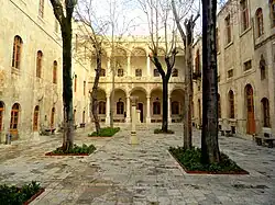 During the 19th century, the Khan was possessed by the Franciscan Missionaries of Mary, where they founded the first college in Aleppo, the "Collège de Terre-Sainte" (The Holy Land College Arabic: معهد الأرض المقدّسة) along with a nearby church.[1] The rehabilitation works of the building began in 1853 and the college was opened in 1859. However, the construction of the whole complex was completed in 1879. The college has played a significant role in the educational and cultural life of Aleppo and Syria, with the graduation of many prominent politicians and writers within the end of the 19th century and the beginning of the 20th century.