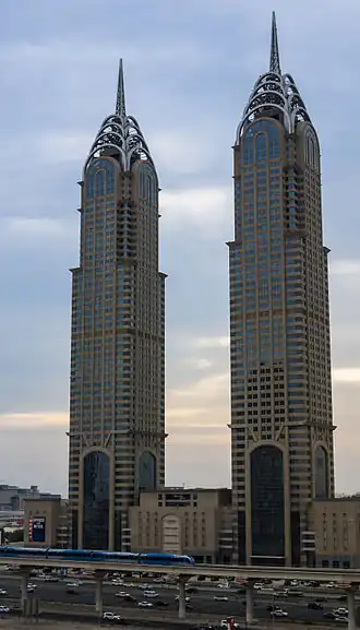 The Business Central Towers form a complex of two 51-floor towers in Dubai Media City in Dubai, United Arab Emirates.[1] Both towers have an equal total structural height of 265 meters (869 ft) and resemble New York City's Chrysler Building. Both towers were topped out in November 2007 and were completed in early 2008. Originally named the Al Kazim Tower Towers, the towers were renamed as the Business Central Towers, a more friendly name for all foreign companies in both buildings.