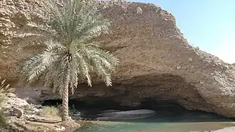 The cave features a large chamber with domes, and most of the cavity is spacious enough to stand upright. Visitors can reach the cave by driving through a flat gravel plain, as it is connected to the road. At the entrance, a few palm trees grow, benefiting from the water and shade provided by the surrounding Wadi Madha.[2][3][4][5]
